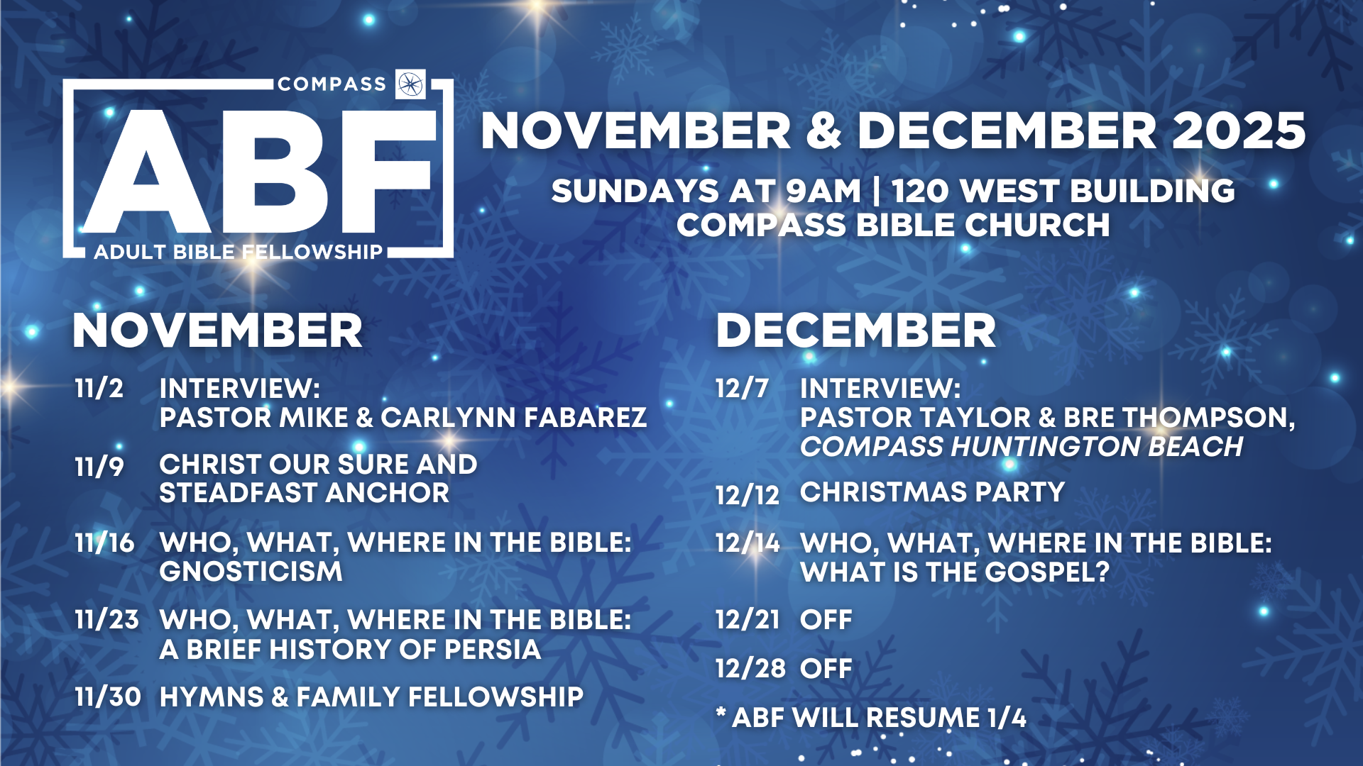 Adult Bible Fellowship (ABF) meets Sunday mornings at 9am in the 120 West Building on the Compass Bible Church campus. Here you will be able to fellowship with other believers over a meal, while engaging in Bible related topics and growing deeper connections with life at Compass.
