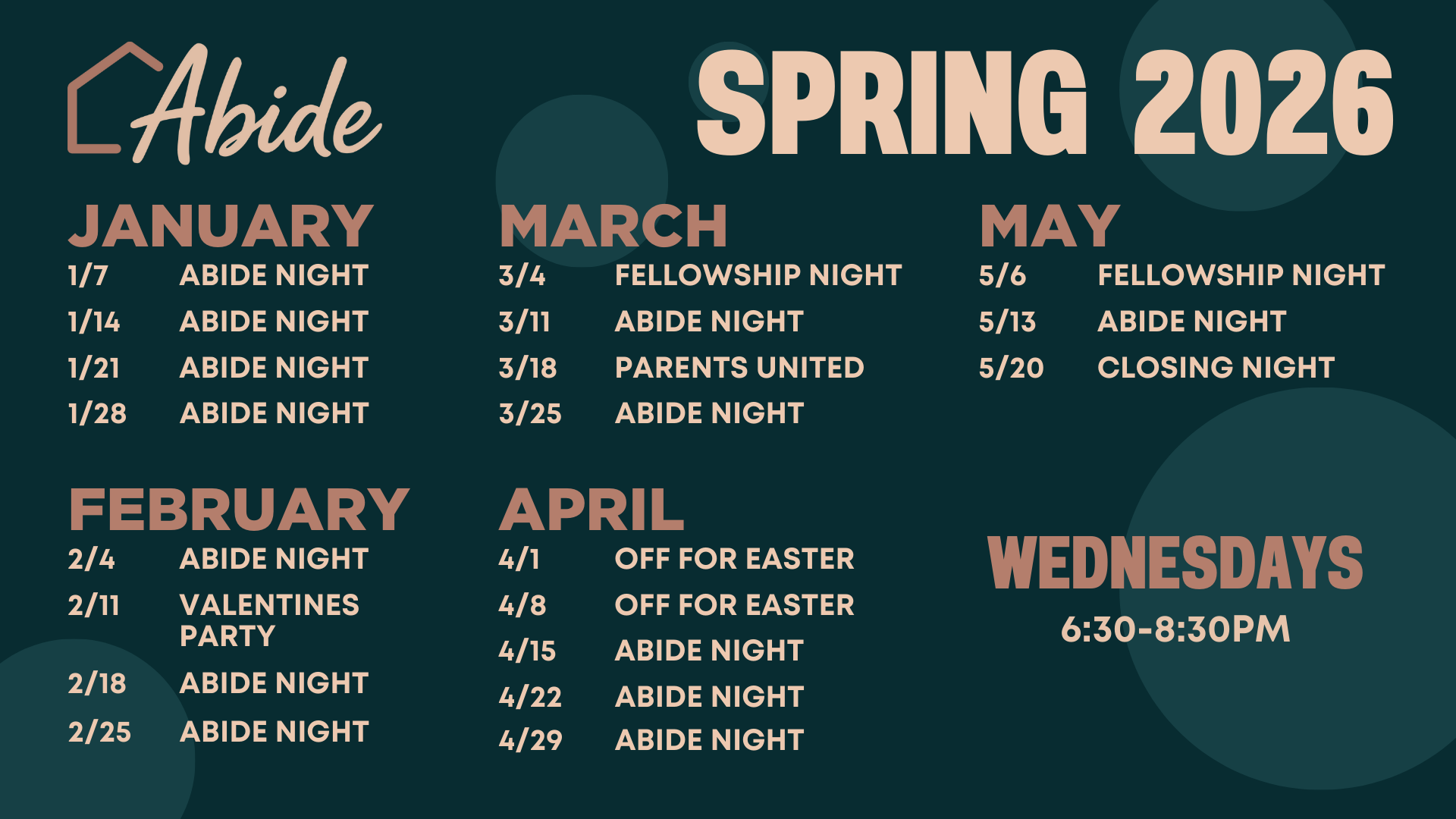 Abide is a ministry for married couples who have teenage children. Abide takes place Wednesday nights at 6:30pm and consists of dinner, a sermon and then small groups. Our junior high and high school ministries meet at the same time in their own small groups on campus.