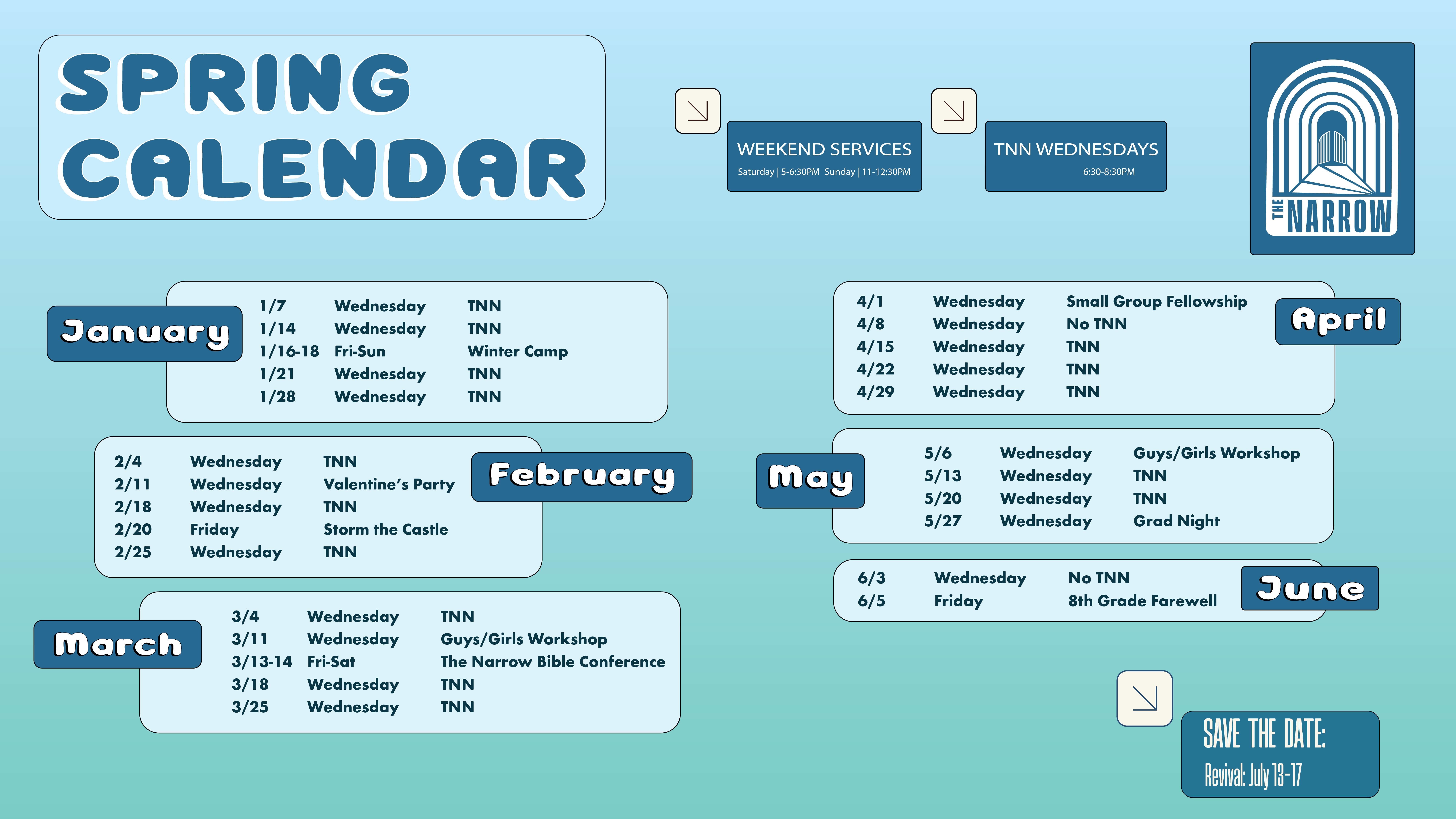Wednesday nights are called The Narrow Night (TNN) around here and we aim to make Wednesday the best night of the week for our 7th and 8th grade students. At TNN, we do it all: dinner, expository preaching, small groups, and more! We believe the best way for students to grow in their understanding of God’s word is through expository preaching and sermon based small group questions. If you have a 7th or 8th grade student, we would love to see them at TNN on Wednesday night!