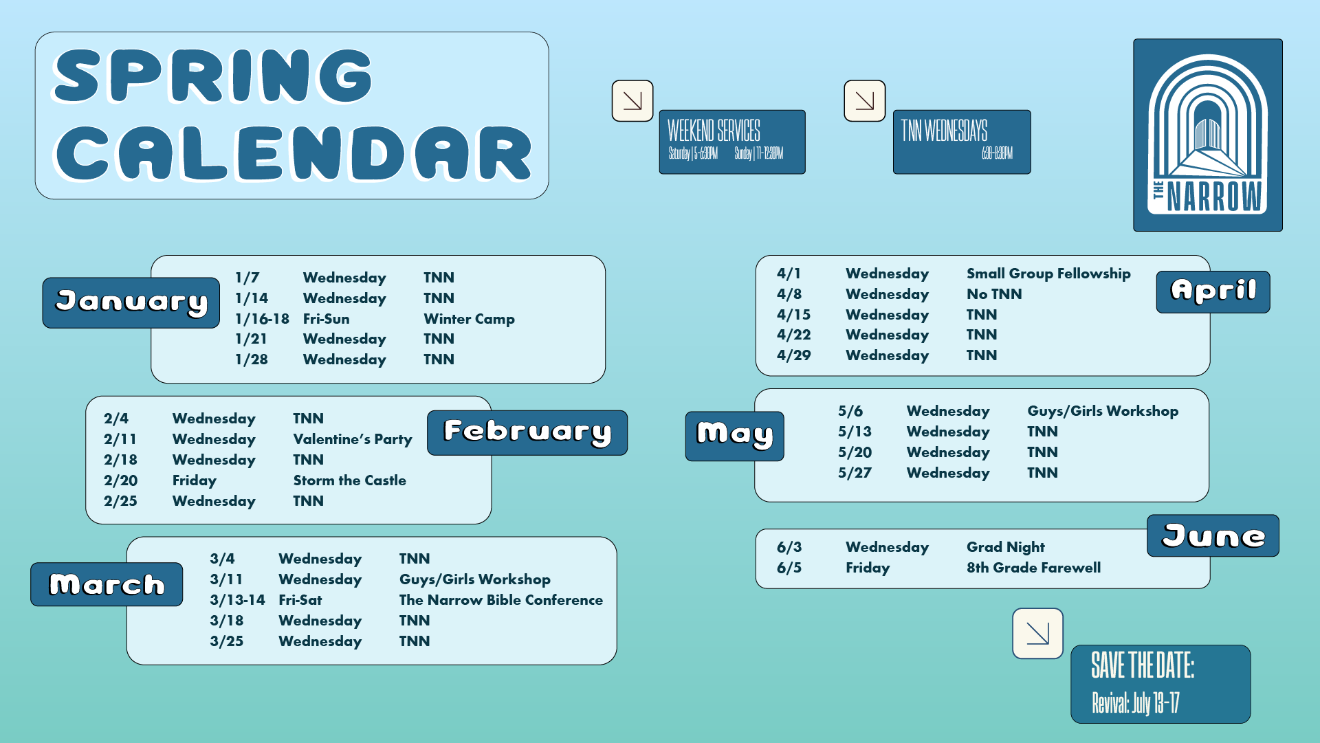 Wednesday nights are called The Narrow Night (TNN) around here and we aim to make Wednesday the best night of the week for our 7th and 8th grade students. At TNN, we do it all: dinner, expository preaching, small groups, and more! We believe the best way for students to grow in their understanding of God’s word is through expository preaching and sermon based small group questions. If you have a 7th or 8th grade student, we would love to see them at TNN on Wednesday night!