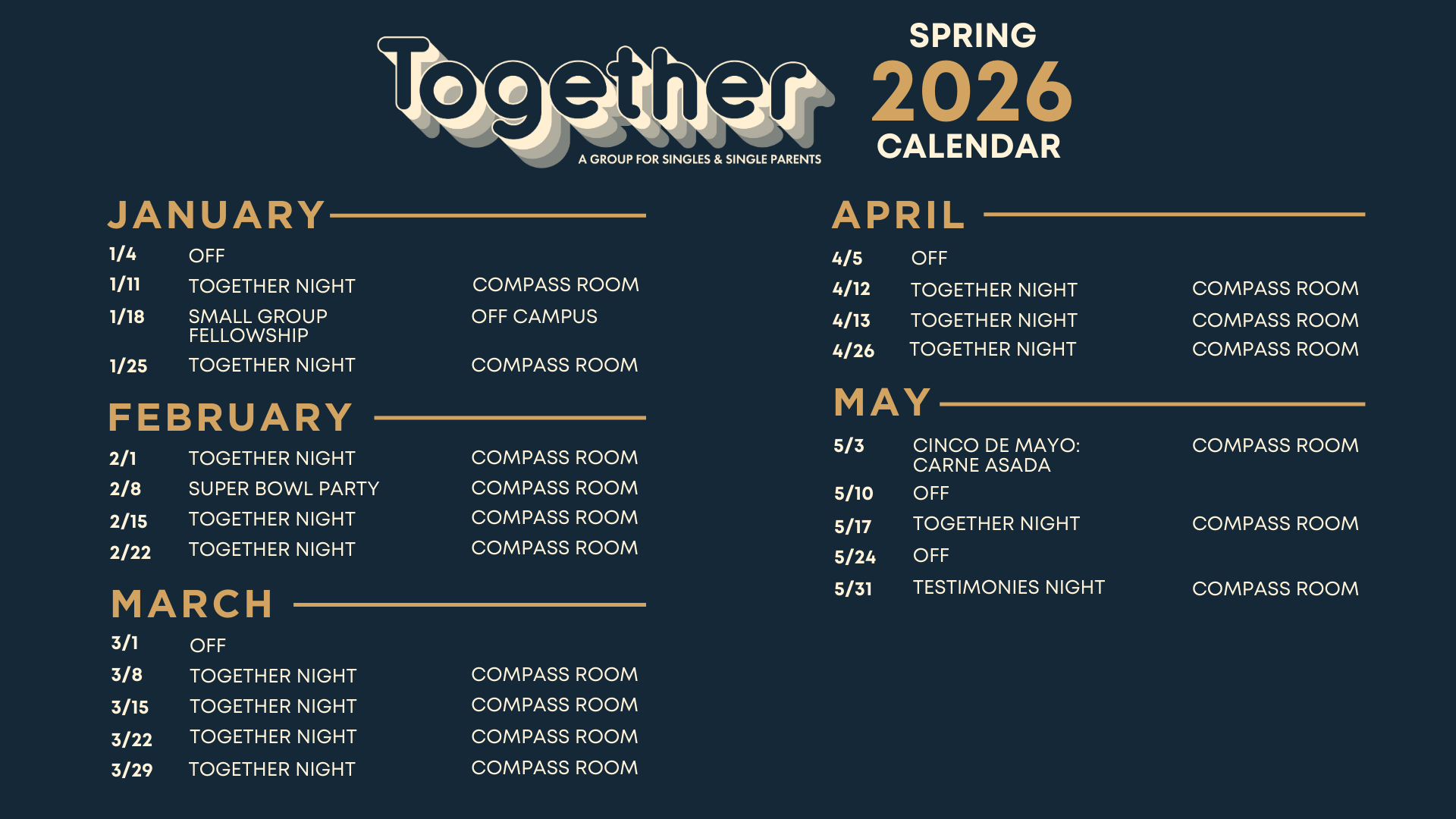 Welcome to Together, a vibrant ministry designed to provide a nurturing and supportive community for single parents and singles, generally aged 35 to 55. We meet on Sunday at 5:30 PM at 140 Columbia, Aliso Viejo.